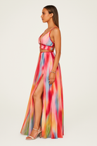 This stunning dress features a deep V-neckline with double waist straps and a dramatic side slit. The soft, flowing fabric showcases a dreamy tie-dye pattern with a light, airy drape. Thin shoulder straps and a high leg opening add a bold, confident touch to this elegant silhouette.